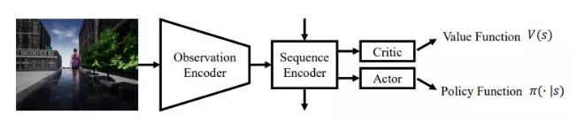 端到端的主动跟踪器主要由三个部分组成:观测编码器(Observation Encoder),序列编码器(Sequence Encoder)和演员-批评家网络(Actor-Critic Network)。如下图所示:
