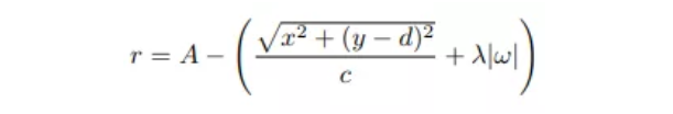 在强化学习中,奖赏函数会引导智能体学习,对最终学习效果起着至关重要的作用。针对主动目标跟踪任务,我们需要设计一个奖赏函数以引导智能体学习。最直观的想法应该是在目标接近期望位置时给与奖励,在远离时给与惩罚。因此,我们以跟踪器为中心定义了一个平行于地面的坐标系,y 轴指向相机前方,x 轴由相机左方指向正右方。对应的,我们用 (x,y) 和 ω 分别表示目标相对跟踪器的位置和朝向。从而,我们得到了如下一个奖赏函数: