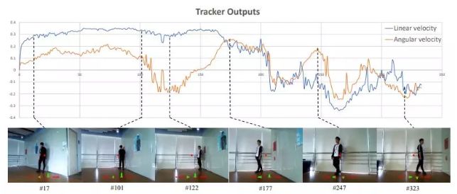 实验证明,在仿真环境训练得到的跟踪器能取得很好的泛化能力,在没见过的目标外观、移动轨迹、背景外观和干扰物体出现等情况下都能较稳定工作。当目标偶然消失时,跟踪器也能鲁棒地恢复跟踪。我们还发现,这种只在仿真器中训练得到的主动跟踪器是有可能直接迁移到真实场景中工作的。我们分两阶段实验,验证了这种虚拟到现实迁移的能力。首先,我们在 VOT 数据集进行了定性测试,即观察动作输出的合理性。最终,我们系统解决了虚拟到现实的问题,将主动跟踪器成功部署在真实移动机器人上,并进行了定量测试。