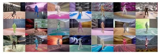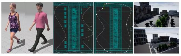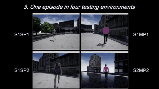 Unreal Engine 环境的地图和示例。从左到右分别为两种外观的目标(Stefani 和 Malcom),两种轨迹(Paht1 和 Path2)和地图(Square1 和 Square2),对应的两种场景的示例,通过不同组合构成了不同的跟踪场景。我们用其中一种组合进行训练,其余组合环境进行测试。