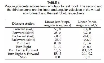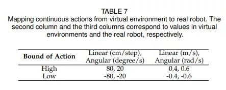 我们也对连续动作空间下的表现能力感兴趣,因此我们尝试了一种二维的动作空间,由线速度和角速度组成。具体的虚拟和现实的设置如下表: