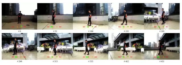 室外阳台的背景包含了建筑物、桌子、椅子、植物和天空。相比于室内场景,室外阳台更加复杂,因为物体是随机杂乱摆放的。另外,由于光线不均匀,相机很难准确曝光,这就需要跟踪器适应不同曝光程度的图像观测(如下图序列)。测试时,目标将沿着场地行走一圈。