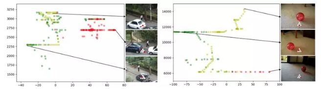 跟踪器输出动作与目标位置和大小的关系。横坐标代表目标中心相对画面中心的偏差,纵坐标代表目标包围框的面积,绿点代表输出左转动作,红点代表右转动作,黄点代表停止/后退。
