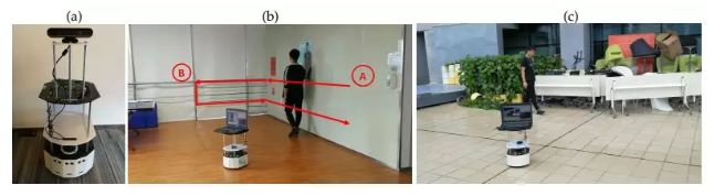 真实场景实验的部署设置。(a) 为实验所用的机器人;(b) (c) 分别为用于测试的室内、室外场景。