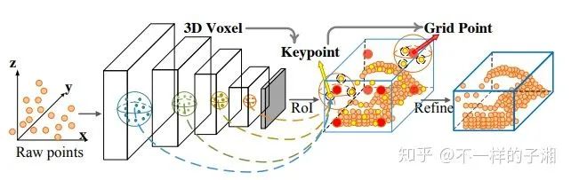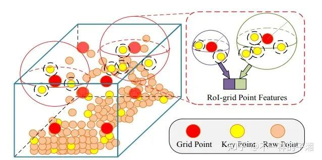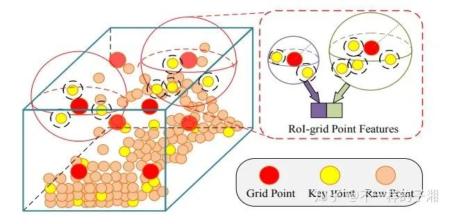 (2)第二阶段为‘keypoint-to-grid RoI feature abstraction’:这一步骤,作者提出了一个新的RoI-grid pooling module,该模块将上一步骤的keypoints的特征和RoI-grid points特特征融合(keypoints和RoI-grid points是什么内容后续会讲到)