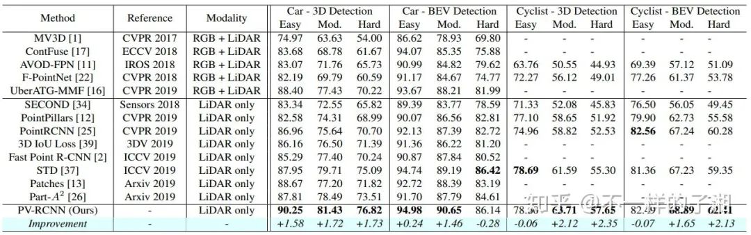 第一次在知乎上进行自己的创作,研究方向是3D目标检测,之后也有空也会不时更新知乎的文章,目前将自己的学习都记录在CSDN博客上,已经有一些如voxel-based的方法的深入研究和代码阅读以及自己的一些想法和实验,有时间的话也会陆续把博客迁到知乎平台共同学习交流。今天这一篇是19年12月30日放到arxiv上的,其实在CVPR2020截止后就一直在关注这一篇文章何时会放出来,毕竟在KITTI的3D检测上高居榜首,并且远远的超过了第二名。如下: