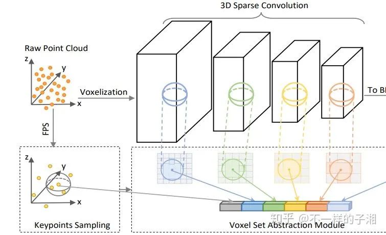 (2)进一步的,P2提出的set-abstruction的操作很好的编码“可变”领域的特征,后续考虑到去voxel上差值的内存占用,作者提出了先提出关键点,然后再利用关键点编码voxel卷积过程的多尺度特征。