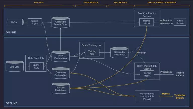Michaelangelo 使用在线和离线流水线分开管理数据。另外,为了在组织内共享和重用知识,使用了一个“特征存储”: