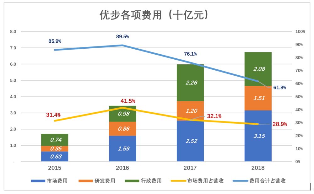 2016年,优步市场、研发、行政费用合计34.4亿美元,占净营收的89.5%。2018年,三项费用合计67.4亿美元,占净营收的61.8%,较2017年掉了将近28个百分点。