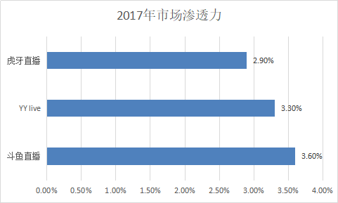 根据极光数据发布的数据显示去年12月份游戏直播平台渗透率前三分别是斗鱼占比3.6%,虎牙为2.9%,熊猫直播1.7%。