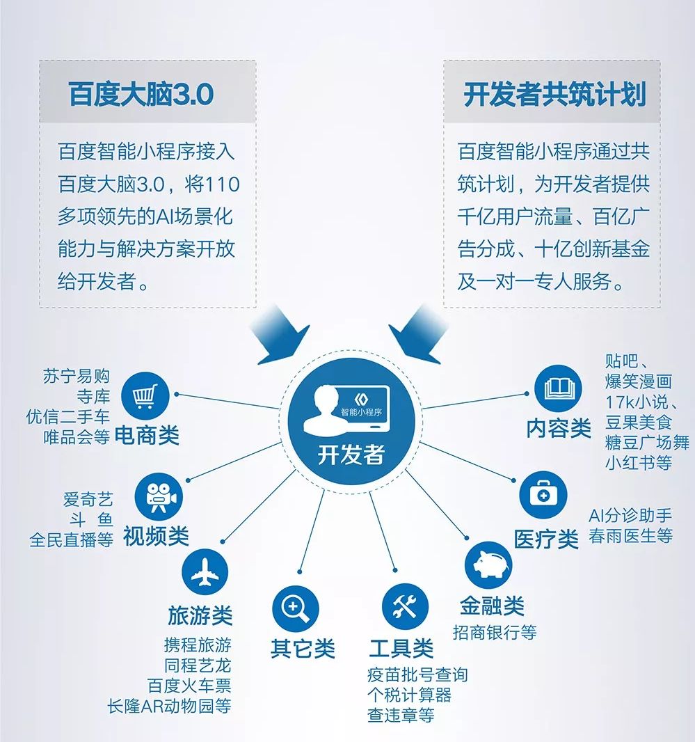 在百度智能小程序平台中,每一个App都能借助其技术优势,构建自己的小程序生态,强化核心业务竞争力。与此同时,在越来越多的App和平台接入下,成员、开发者只需开发一套智能小程序,便可以在百度App、联盟中所有平台上运行,低成本快速建立跨平台生态。