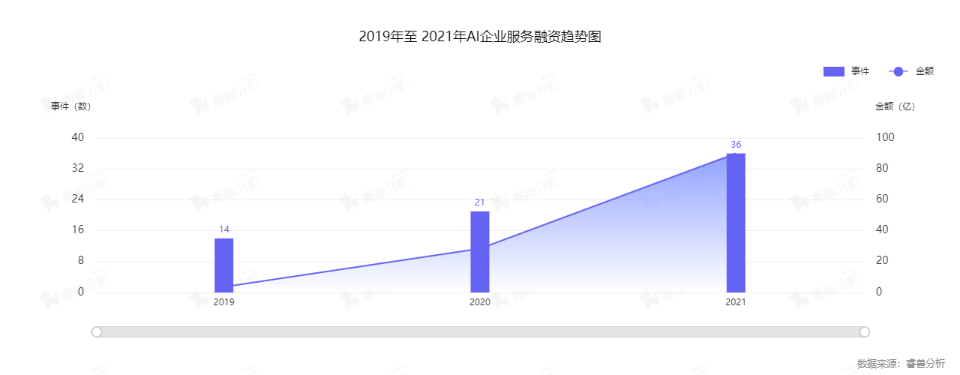 睿兽分析数据显示,2019-2021年AI企业服务市场投融资事件数及金额整体均呈上升趋势,