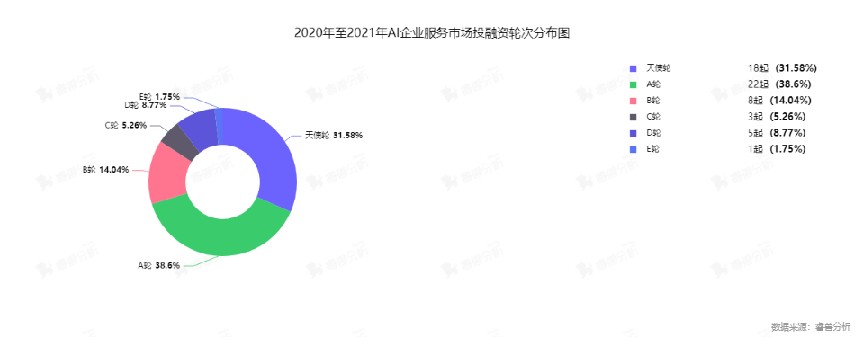 睿兽分析数据显示,2020-2021年AI企业服务市场投融资事件轮次分布最多在