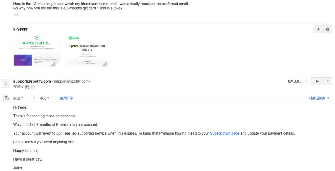 好的,有图有真相,这么好的打脸机会肯定不能放过啦,截图丢上,结果当然是 Spotify 认怂给我弥补回 9 个月的服务。