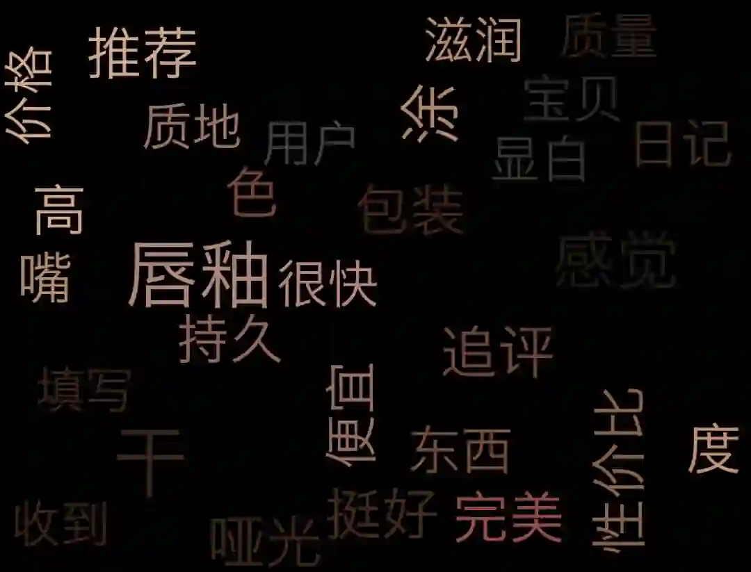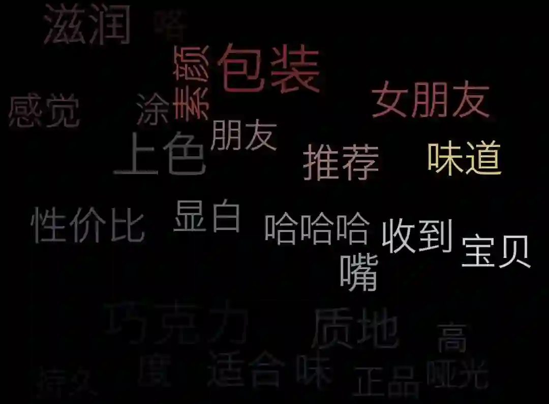 这款产品有个高频词是“女朋友”,可见是赠女友佳品了。“易上色”“味道好闻”也是这个产品的一大特色。