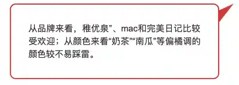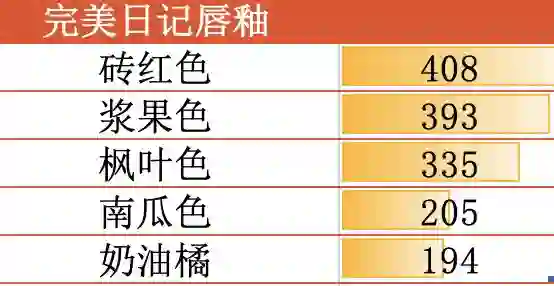 这款产品各个颜色都卖得蛮好的,“砖红色”最受欢迎,其次是“浆果色”,然后是“枫叶色”“南瓜色”和“奶油橘”这三类偏橘调的颜色。