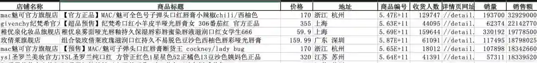 本次按销量爬取淘宝2019款口红产品,包括店铺名称、商品标题、价格、地址、商品编号、收货人和商品详情页链接,共2019条数据。