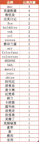 手动判断了一下TOP50产品的品牌,发现MAC魅可、美康粉黛和稚优泉均出现了4次,并列第一,其次是完美日记。