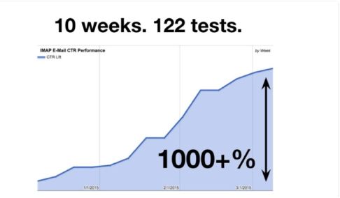 他们做了122个测试,这个测试有的比较复杂,有的比较简单。最终的结果是,短短十周的时间,邮件的指标提高了1000%,以这样一种增长黑客的方式做增长,确实有实在的效果。
