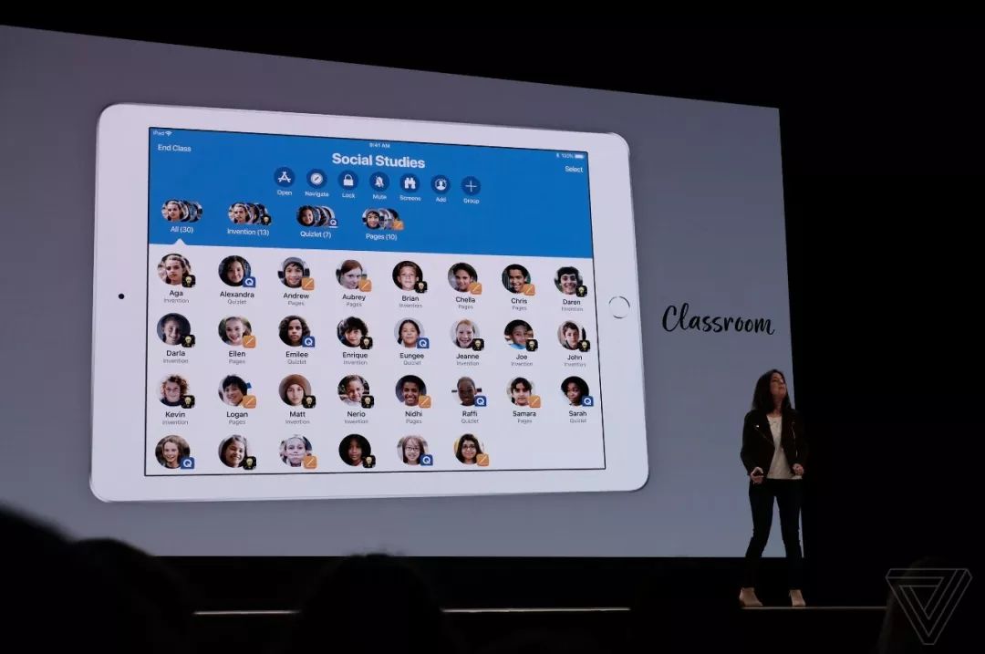 面向老师,苹果发布 Classroom App 和 Schoolwork App。通过 Classroom App,老师可以远程控制学生的设备、监控他们如何使用 iPad、把学生的 iPad 屏幕连接到 Apple TV 上。据介绍,beta 版的 Classroom 即将于 6 月登陆 Mac。