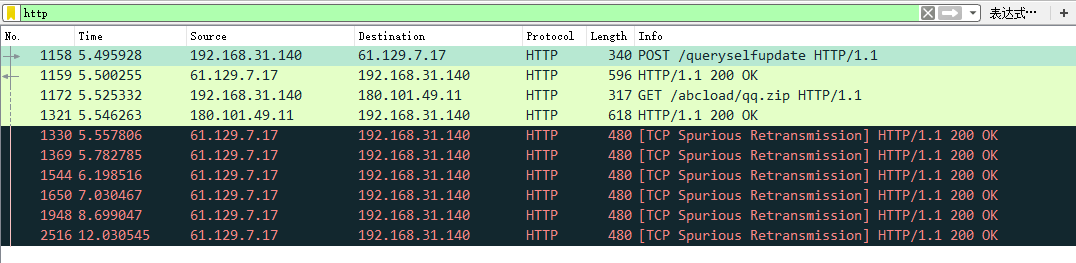 需要说明的是,该URL“www.baidu.com/abcload/qq.zip ”事实上是无效地址,但在被劫持的现场中,对该地址的HTTP GET请求会收到相应的响应包,并且会下载到包含病毒的qq.zip压缩包。