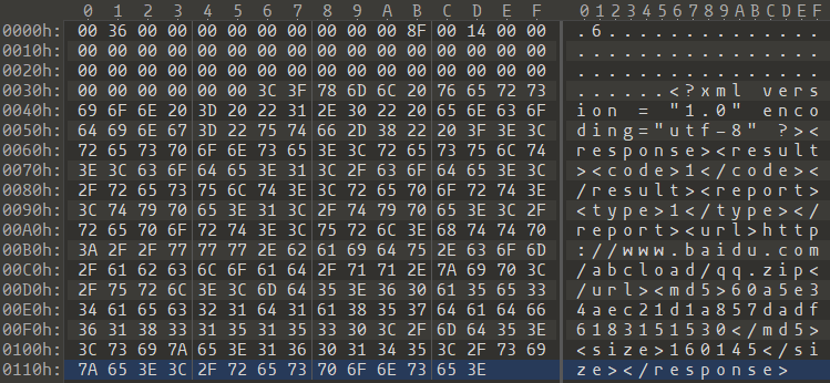 POST的数据没有问题,但是在网络数据中可以看到一个伪造的回应数据包,该回应包数据包含一个二进制头,在二进制头之后依次是:更新的ZIP包下载地址,ZIP包的MD5校验值,ZIP包大小。数据如下: