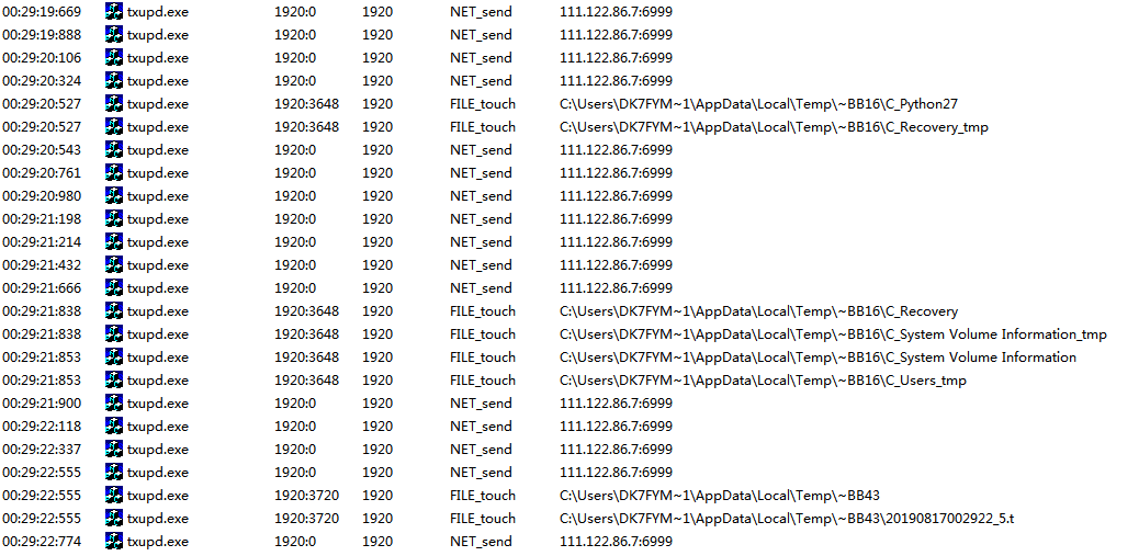 使用火绒剑监控下载到的病毒程序“txupd.exe”会向多个C&C服务器(111.122.86.7、111.120.23.23等)回传获得的用户数据,如下图所示: