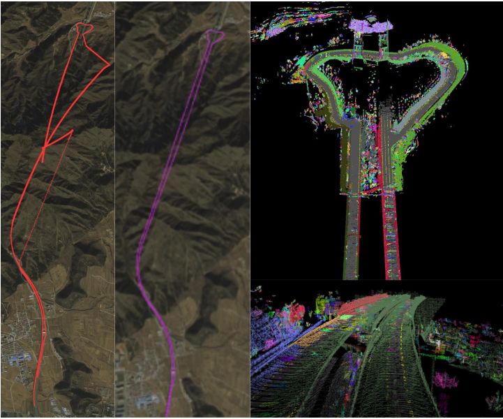 上图中,左图是一张长隧道的道路图像,在隧道中,GNSS信号较弱,驶出隧道时,GNSS信号也会有很大的跳变,所以,收集的数据会有很大的误差。中间的图是位姿优化后的轨迹。右图是隧道出口和内部的点云地图。