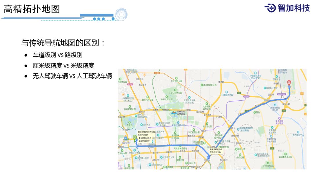 高精拓扑地图与传统导航地图的区别如上图。由于人脑拥有强大的计算和规划能力,传统导航地图的精度和功能对我们完全足够,但对于电脑操纵的无人驾驶车辆,就需要更高的精度。