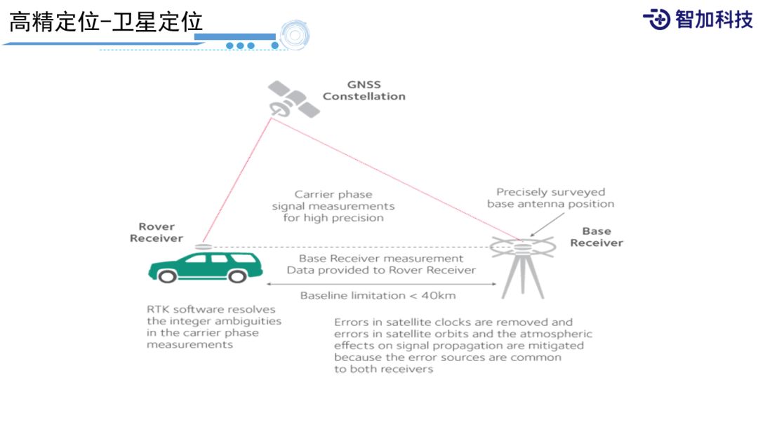 卫星定位算法的原理是:在车辆行驶的某一位置,可以接受到各个卫星的信号,通过对该位置和各个卫星之间距离的解算,就可以得到该位置的坐标。但是,在收集卫星信号的过程中,会受到电离层和对流层的影响,产生时延等误差,导致米级别的定位误差。为了将误差缩小,需要利用RTK载波相位差分技术进行定位修正,即通过寻找离当前位置较近的、已知精确位置基站,通过接受基站数据,对卫星数据进行修正。