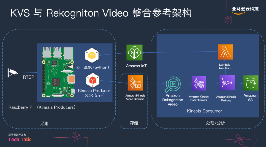 上图是 Amazon KVS 和 Amazon Rekognition Video 整合的参考架构。由采集端、存储端、处理 / 分析端三部分组成。该实例在 Raspberry Pi 环境中运行,用 RTSP 摄像头去拉流,拉流完成之后,通过 C++ 的 Producer SDK 打到 KVS 上,后面用 Rekognition Video Processor 处理实时的视频流,处理完成后,会把结果放到 Kinesis Date Streams 消息管道中,消息管道将数据给到 Kinesis Data Firehose,对消息管道的数据稍作转换加工,然后投递到 Amazon S3,由 Amazon S3 将结果存储起来。另外一条线路,可以触发 Amazon Lambda,Amazon Lambda 将调用 IoT Core 对设备下发控制指令。