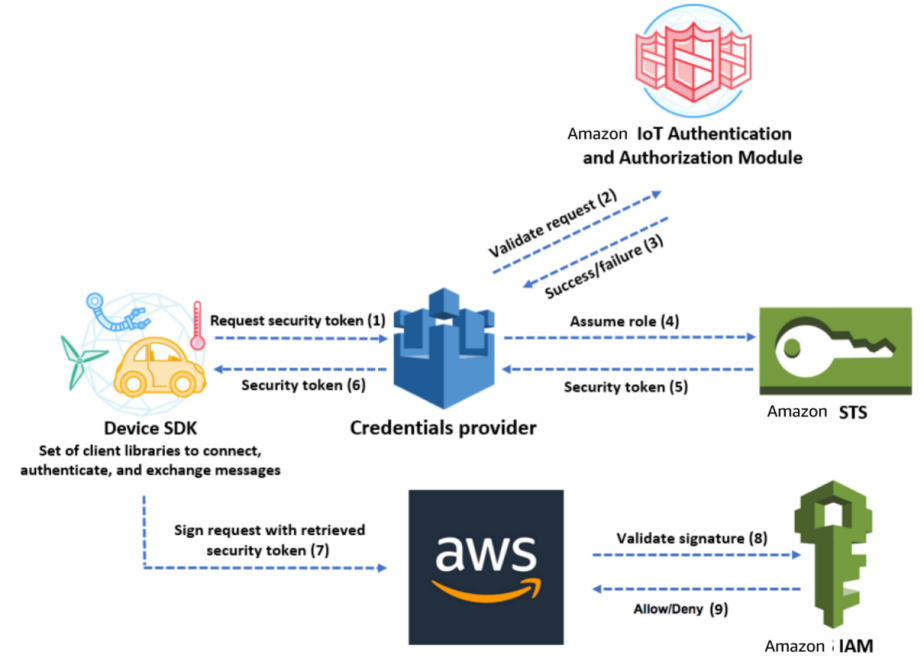 视觉安防相关的产品,安全是企业和用户关注的重点。亚马逊云科技针对智能产品的安全性也有相应的解决方案。摄像头在向 Amazon KVS 做推流的过程中,是需要进行验证的,只有验证通过后,经过授权才能获取资源的访问权限。摄像头利用 IoT 设备的证书来访问资源,流程如下:
