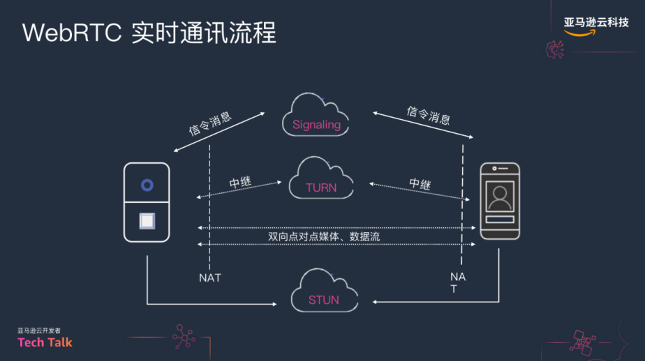 主要依赖 WebRTC 集成。左边是硬件设备,如安防摄像头、可视门铃等,里面会包含各种 SDK,中间是 Amazon KVS,右边是消费端。通过 WebRTC 连接到 Alexa 云,实现双向实时通讯。