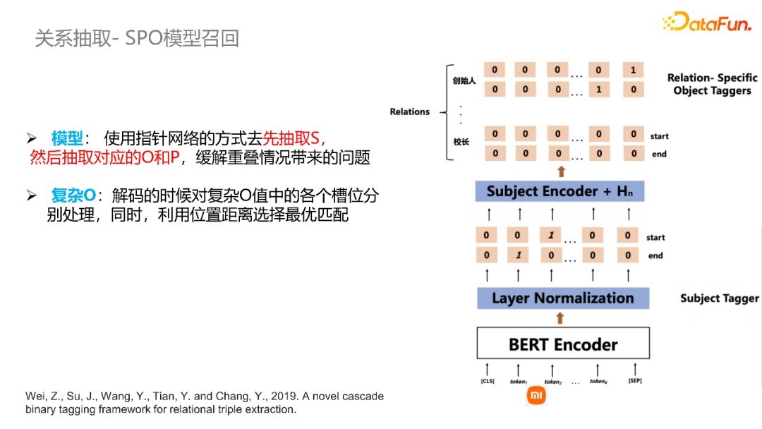 SPO模型:首先通过指针网络的方式抽取s,然后根据s在schema当中对应的p,再通过指针网络的方式找到每一个p在文本当中对应的o的文本片段。上图所示为SPO模型的大体框架图,输入文本后,首先通过编码层对语义信息进行表示,再通过解码网络找到其中的subject,然后将这个subject和输入文本连接起来,再在schema中获取其涉及到的所有谓词,通过指针网络来找到每个谓词下是否存在对应的片段,从而找到这个p和o的结果。对于复杂o值,我们对当中各个槽位都分开来分别处理,并且结合位置距离来选择最优的匹配,最终将复杂o值各个槽位得到的文本结果组合起来作为这个复杂o值的结果。