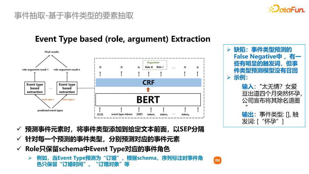 基于这种方式,我们发现结果会有一些欠召回的情形。比如上图右框中的例子,实际上这个句子中存在一个明显的触发词“怀孕”。但是事件类型预测模型就发生了欠召,没能识别出它的事件类型。这时候如果是基于事件触发词来对这个事件要素进行抽取,则可以和基于事件类型的模型进行互补。