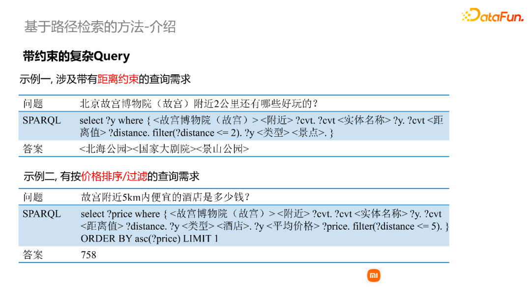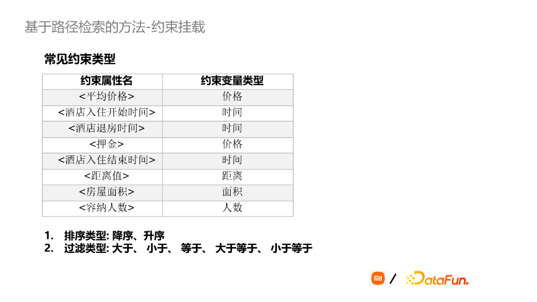 我们总结了可以加约束信息的常见属性,比如平均价格、酒店入住时间、押金、距离值、房屋面积等。在路径扩展过程中,如果发现某一个属性的取值是数值时,就可以对它进行约束挂载,从而表达出query中的复杂语义信息。