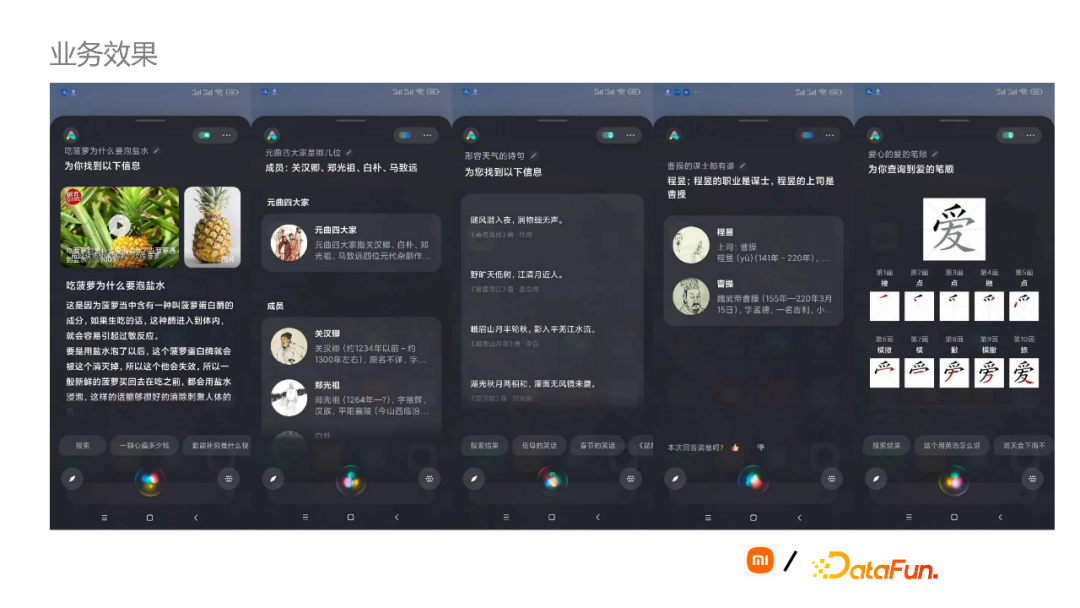 最后我们列举了几个图谱问答的示意效果图。图谱问答的结果更适应结构化展示的需求,能满足精品化的产品需求,为用户提供更好的使用体验。