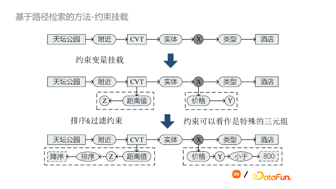 约束挂载如上图所示。“离天坛最近的酒店人均800以下酒店是哪一家”,首先通过路径扩展得到上图最上方所示的路径,然后进一步约束CVT节点对应的距离值,同时对酒店实体X的价格约束为小于800。通过上图方式,我们将约束可以看作一种特殊的三元组。比如要求价格小于800块钱,那么“小于”作为谓词,“800”就是作为object值。对于排序约束,将“排序”作为谓词,然后“降序”作为object。将约束信息统一处理成三元组是为了下一步路径匹配的需要。