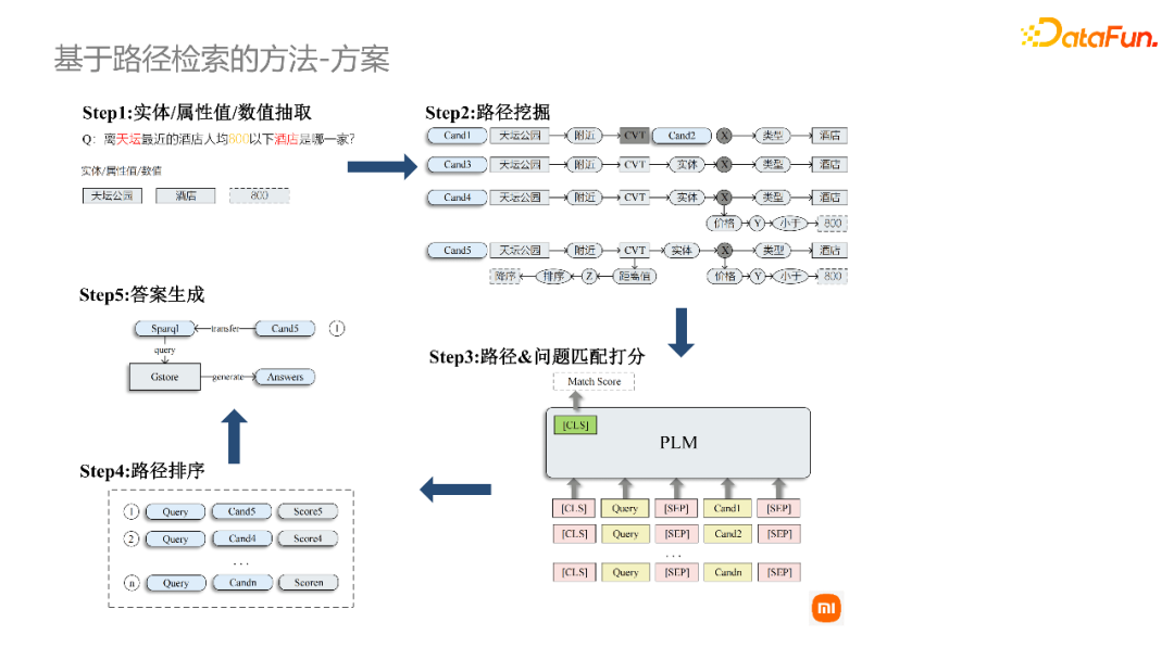整体来讲,我们采用的技术方案的流程为:第一步识别实体和属性值,第二步进行路径的挖掘,第三步进行匹配打分,第四步进行路径排序,最终根据最优路径从图谱中查询答案。