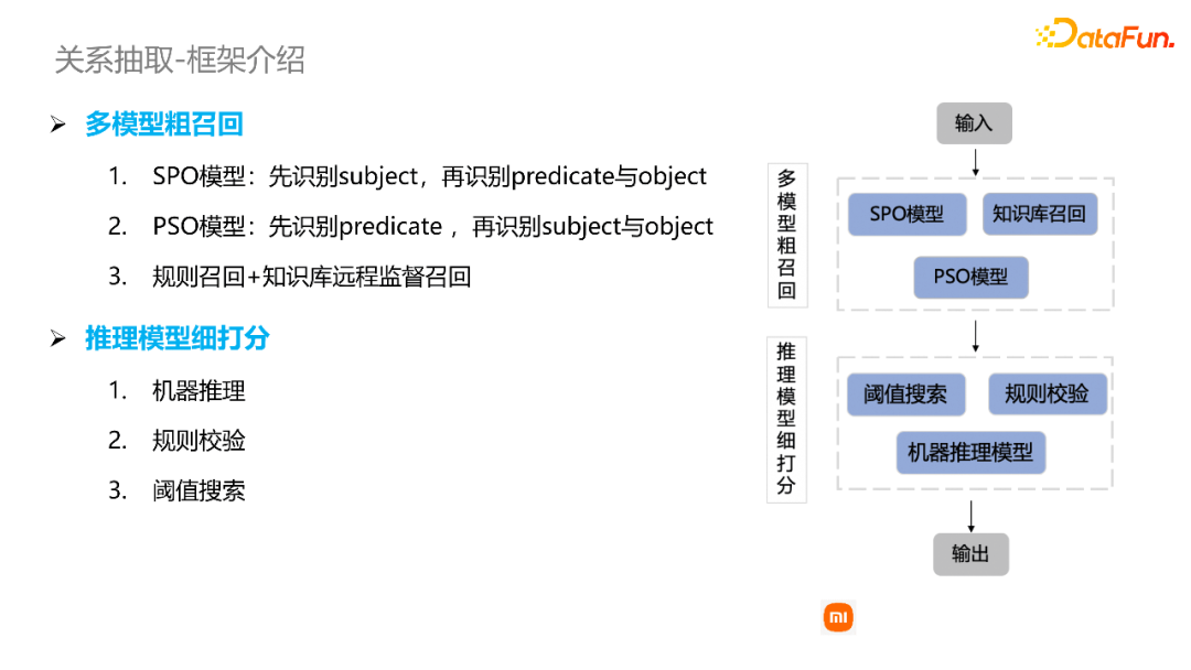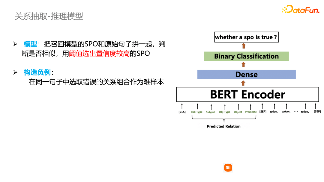 通过SPO模型和PSO模型,得到一些三元组关系的候选队列,还有一个精排的细打分模型。将召回的spo三元组和原始的句子拼接在一起,建模成一个语义相似度的任务,来衡量识别出来的spo三元组和输入文本之间的语义相似度,从而进行细打分。我们可以设定一些阈值,选出置信度较高的一些spo三元组作为最终的抽取结果。