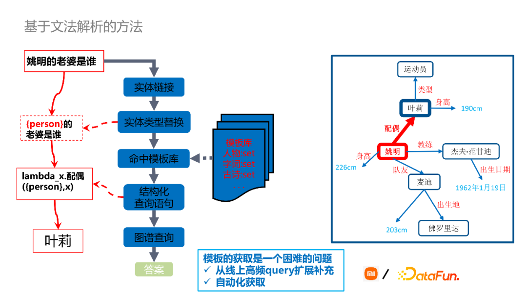 如下图,对用户query进行解析,从模板库中找到与用户query匹配的模板,再通过这个模板把用户非结构的query解析成为结构化的查询语句,进而从图谱中去查找得到答案。这个过程是比较简单的,但主要的问题在于如何高效快速的获取大批量的模板。一方面可以从线上高频query进行扩展补充,这是从业务出发的一种方式,能够尽快满足用户需求。第二种,可以通过挖掘的方式来自动化地获取。