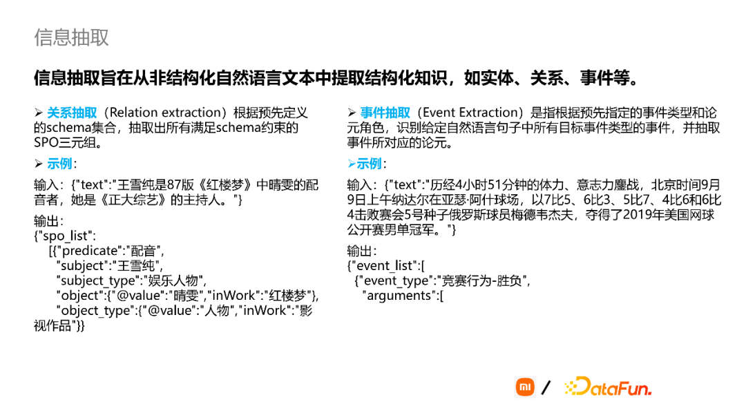 信息抽取是指从非结构化的自然语言文本中提取结构化的知识,如实体、关系、事件等。关系抽取会预先定义好一个schema,然后抽取所有满足schema约束的SPO三元组。事件抽取也是先预先定义好事件类型和论元角色,再从输入的自然语言文本当中识别事件类型,以及这个事件类型对应的一些事件要素。这里举一个关系抽取的例子,“王雪纯是87版《红楼梦》中晴雯的配音者,她是《正大综艺》的主持人”,我们需要去识别出来subject是王雪纯,predicate是配音,object是人物,配音的人物是晴雯。这里的object是一个复合类型,需要同时识别出来配音的角色是谁,属于哪部影视作品。