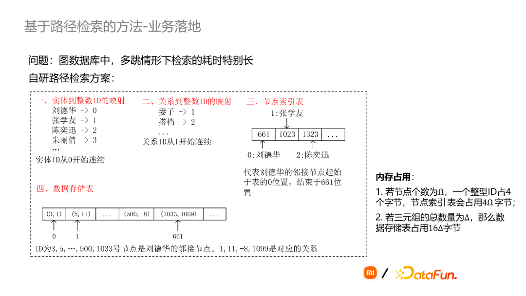 这里简单介绍一下我们自研的路径检索工具。我们将图谱里的实体和关系,进行整型id的映射,然后通过一个节点索引表来记录每个实体对应的SPO三元组,比如刘德华所对应的三元组的终止节点在661,也就是说找刘德华的三元组时,可以快速地在数据存储表中的第0位到第661位进行查找,这里的查找可以通过二分法进一步加速。通过这种方式使检索耗时大大减少,内存的占用也会非常的小。