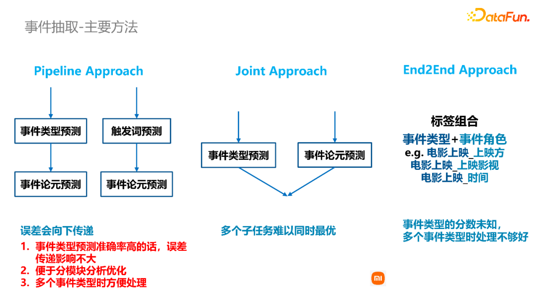 第三种是端到端的方法,我们对标签组合进行了一些调整,将事件类型和事件角色名组合起来,构成一个新的标签组合。通过BIO标注后可以一步到位地识别文本中包含的事件类型,和这个事件类型下每个角色的取值。因为是直接通过序列标注的方式抽取得到两个结果,所以事件类型的分数我们无法得知,因此存在多种事件类型时处理不够好。