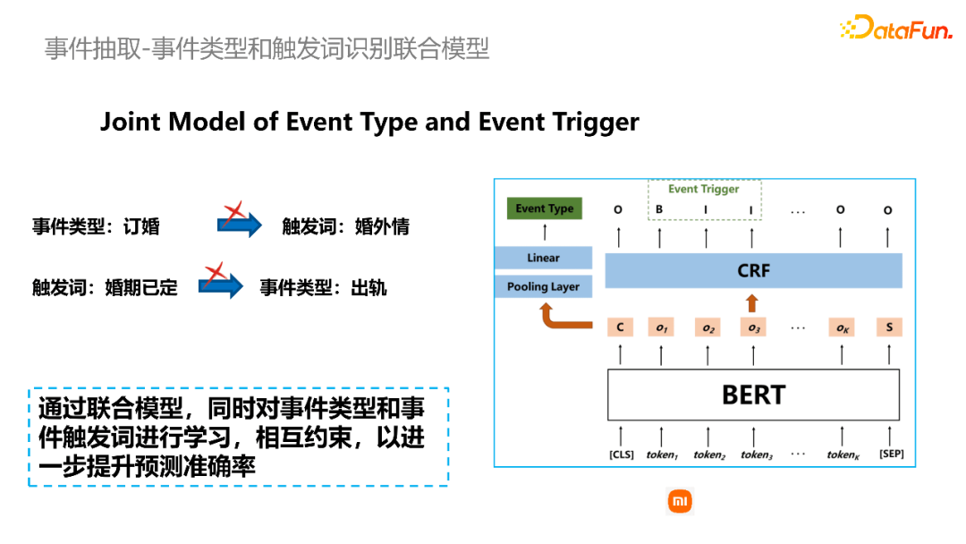 在事件抽取任务中,有的研究者基于事件类型做要素的抽取,有的研究者基于事件触发词做要素的抽取。在这里我们提出事件类型和触发词的联合识别模型。我们发现事件类型和触发词实际上是相互影响的,比如“订婚”这个事件类型,触发词不可能是“婚外情”。相反地,如果给的触发词是“婚期已定”,它对应的事件类型不可能是“出轨”。所以我们是通过联合模型来同时对事件类型和事件触发词进行学习,以进一步提升预测的准确率。