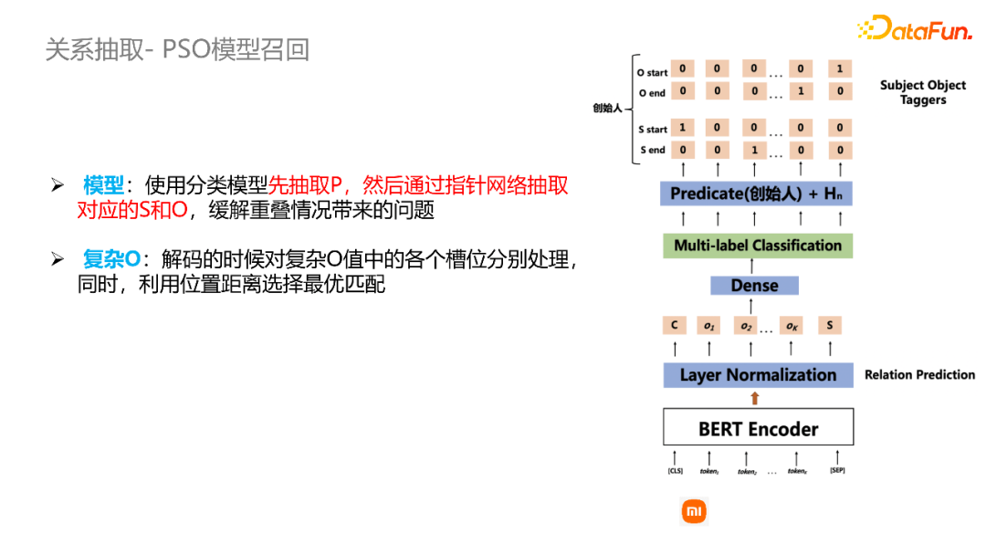 PSO模型:与SPO模型比较类似。我们首先通过分类模型来识别句子中描述的关系类型,再通过指针网络来抽取这个关系类型对应的subject和object。类似我们也可以对复杂o值的各个槽位分别处理,同时利用位置距离来选择最优的匹配。
