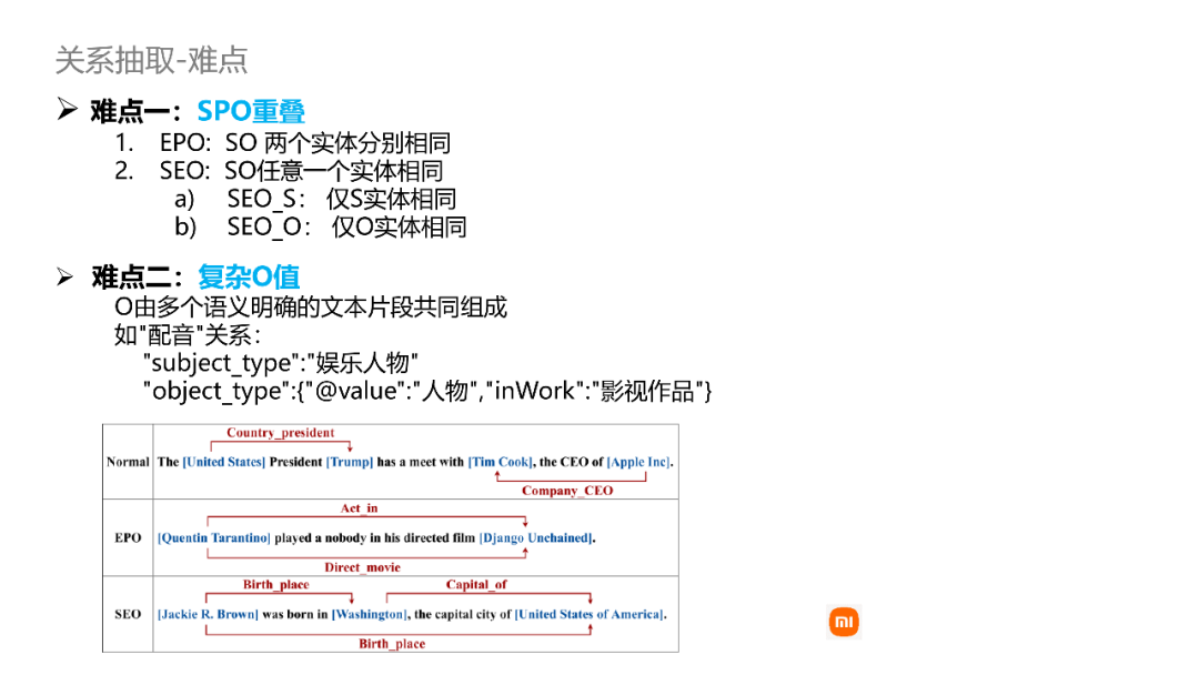 在关系抽取中,除了复杂o值之外,还有spo重叠这种比较常见的难点,如s和o两个实体分别相同。例如,吴京是战狼的主演,同时吴京也是战狼的导演。此时吴京和战狼这两个实体,在这两种关系中都是相同的。spo重叠还有另外一种形式是,s和o当中,其中一个实体是相同的。