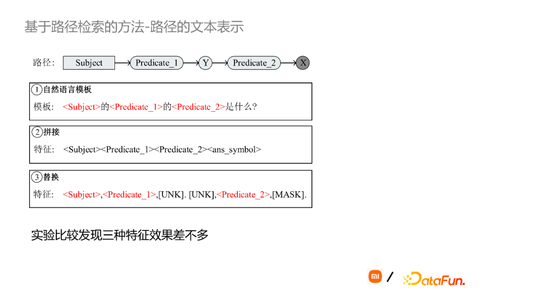 下一步是路径匹配。需要在候选路径中找到最有可能的路径。具体方法为:将路径表达成文本的形式,把它建模成一个语义匹配的任务。路径的文本表示,这里介绍三种方式:第一种方式是设计一个模板将路径表示为一句话;第二种方式是把这个路径中的subject、predicate以及答案节点拼接起来;第三种方式和第二种方式相似,但是把中间节点通过[UNK]字符保留下来。通过实验对比,这三种方式的匹配效果差异不大。选择任意一种方式皆可。