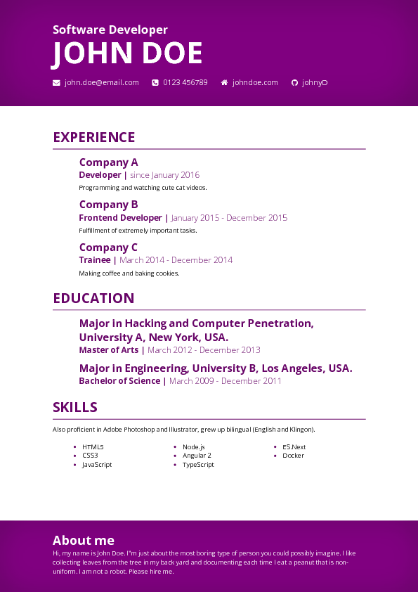 中国程序员简历模板,包括 PHP 、iOS、Android、Web 前端、Java、C/C++、NodeJS、架构师以及通用程序员简历模板。