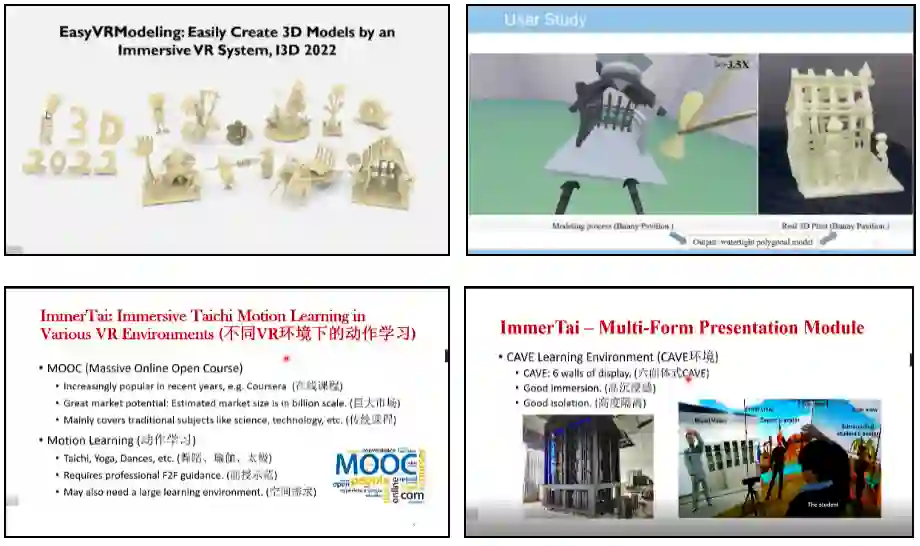 在技术论坛中,大赛组委会邀请了山东大学计算机学院辛士庆副教授和北京工商大学计算机学院陈晓明教授就虚拟现实相关领域做了特邀报告。其中辛士庆教授就基于组件融合的 VR 建模为题,详细讲述了基于组件融合的VR建模的原理以及在元宇宙等新兴VR应用领域的优势。陈晓明教授就沉浸式动作学习与沉浸式体验与大家进行了深入探讨。陈教授以VR技术在太极教学上的应用为例详细讲述了VR技术如何提高动作教学的效率,并分享了光场技术在未来VR领域的应用前景。两位专家的精彩报告赢得了参会者广泛关注并引发了热烈的学术讨论。